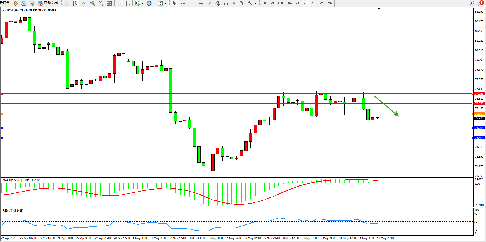 交易策略:75.750下方看跌,目标74.704 73.964