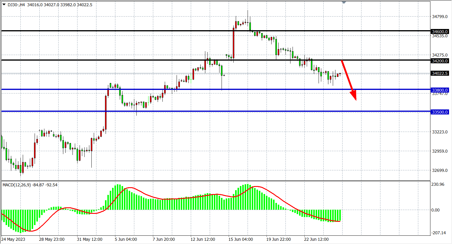 交易策略:34200 下方看跌,目标 33800 33500