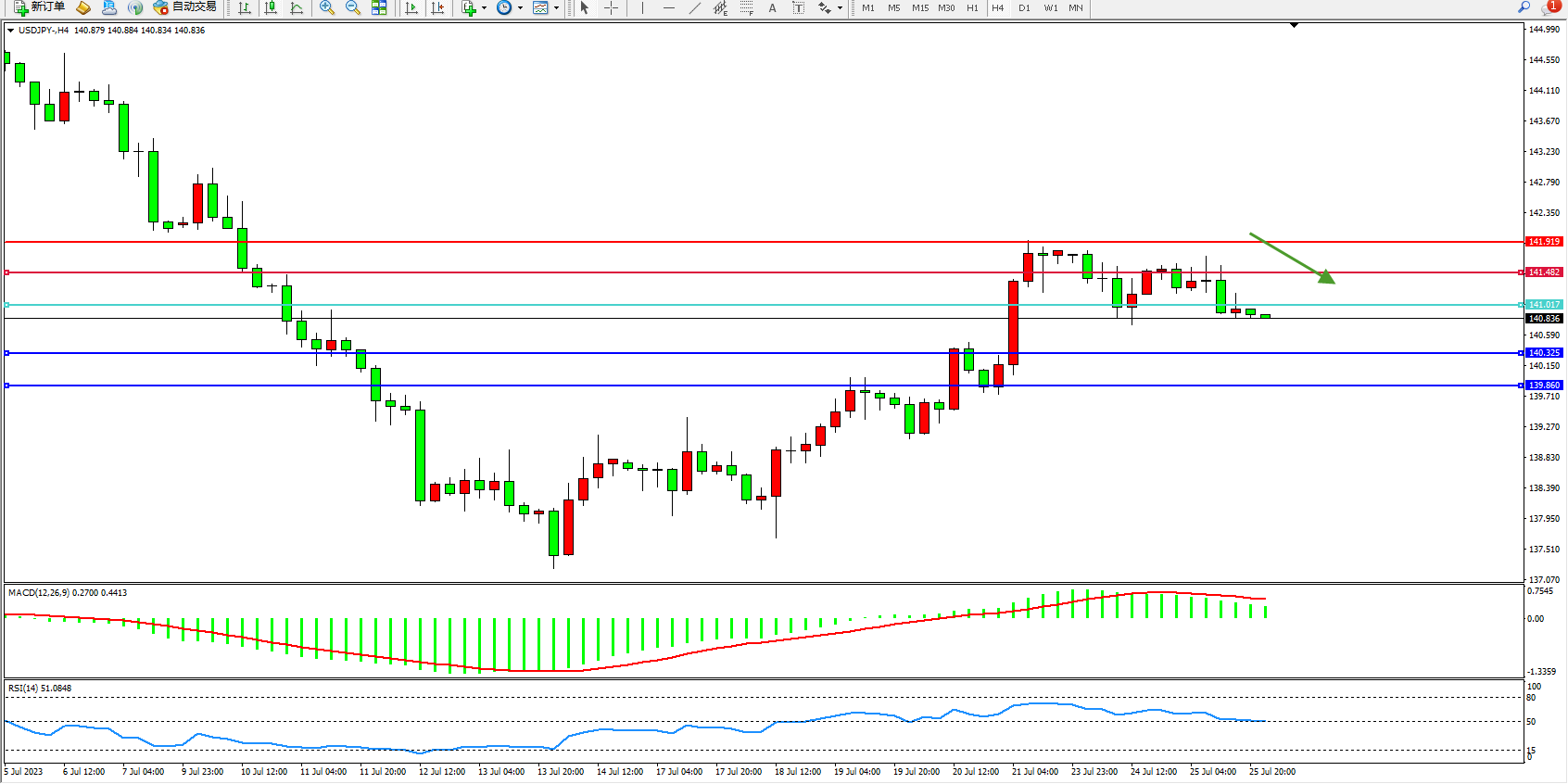 交易策略:141.017下方看跌,目标140.325  139.860