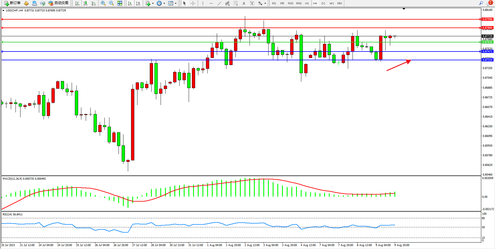 美元瑞郎USDCHF——4小时K线图显示: