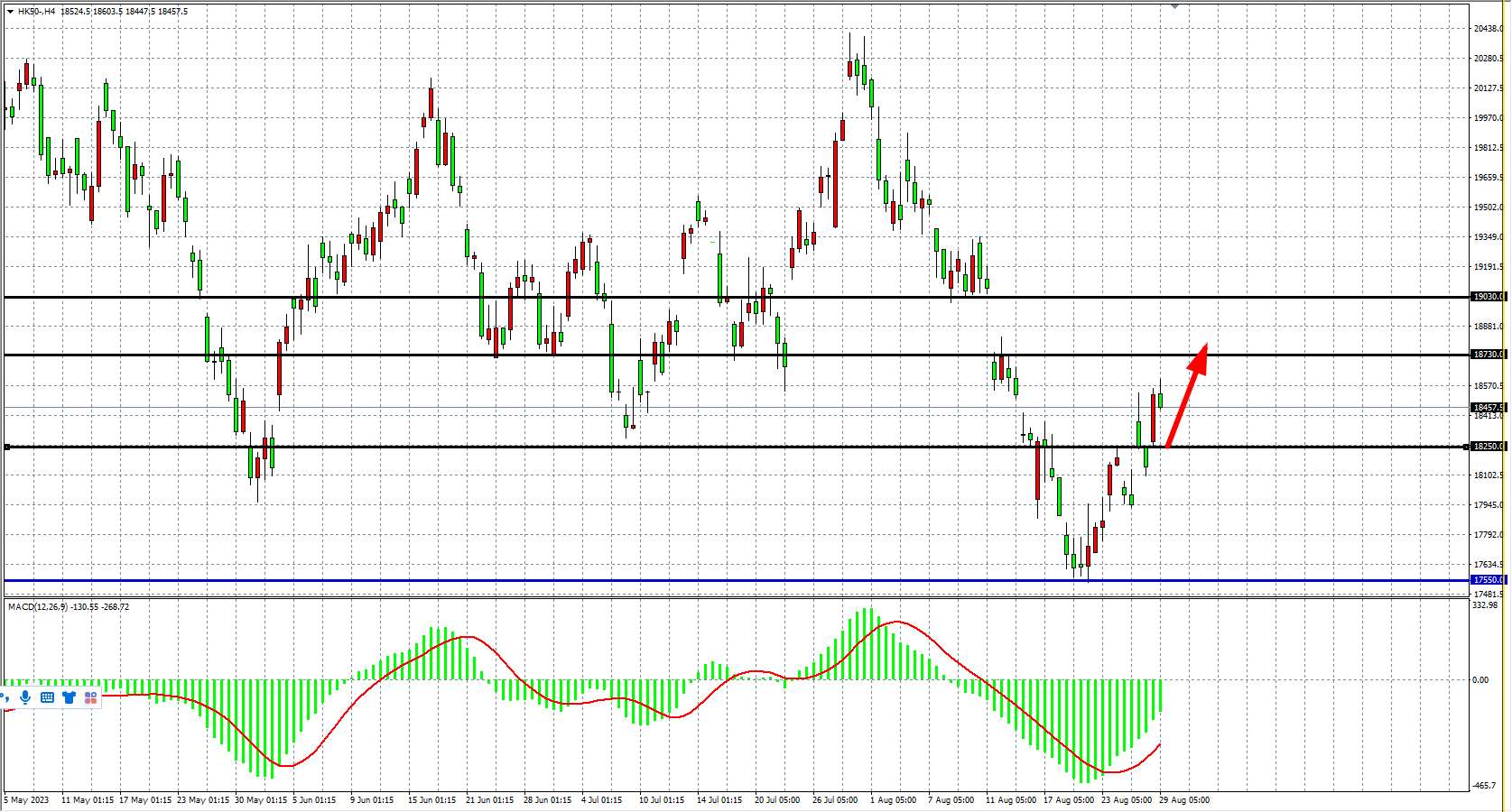 4小时图看,恒指再度高开走强,MACD量能于零轴下方有所缩减,短期趋势多头偏强,支撑关注18250-18000附近,阻力关注18730-19030。