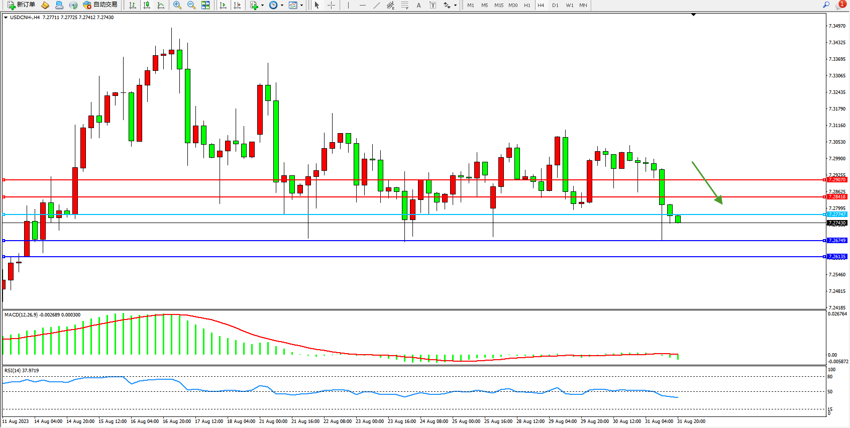 交易策略:7.27747下方看跌,目标7.26749  7.26135