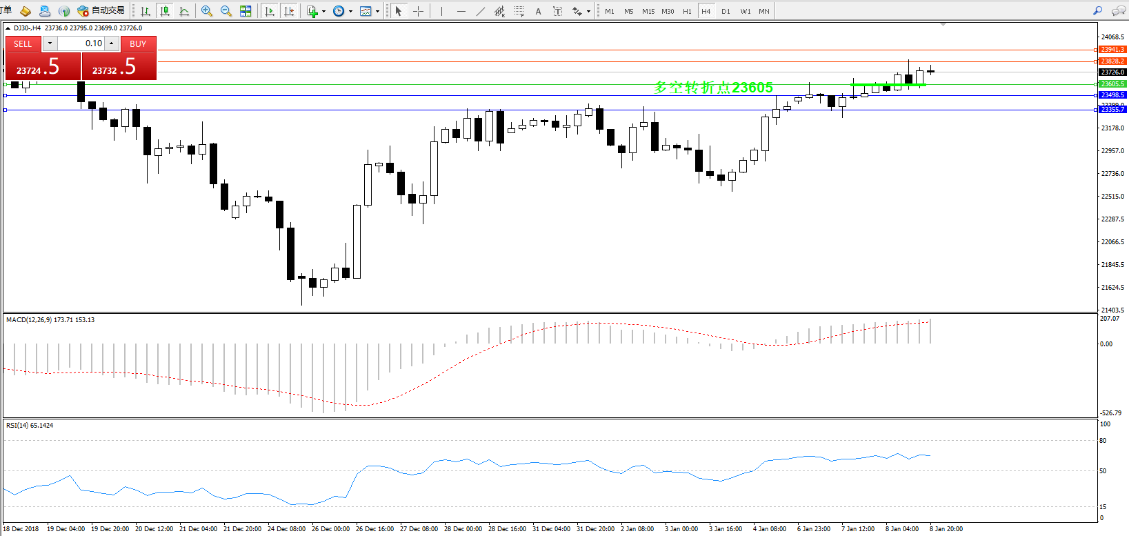 道琼斯指数DJ30—— 4小时K线图显示: