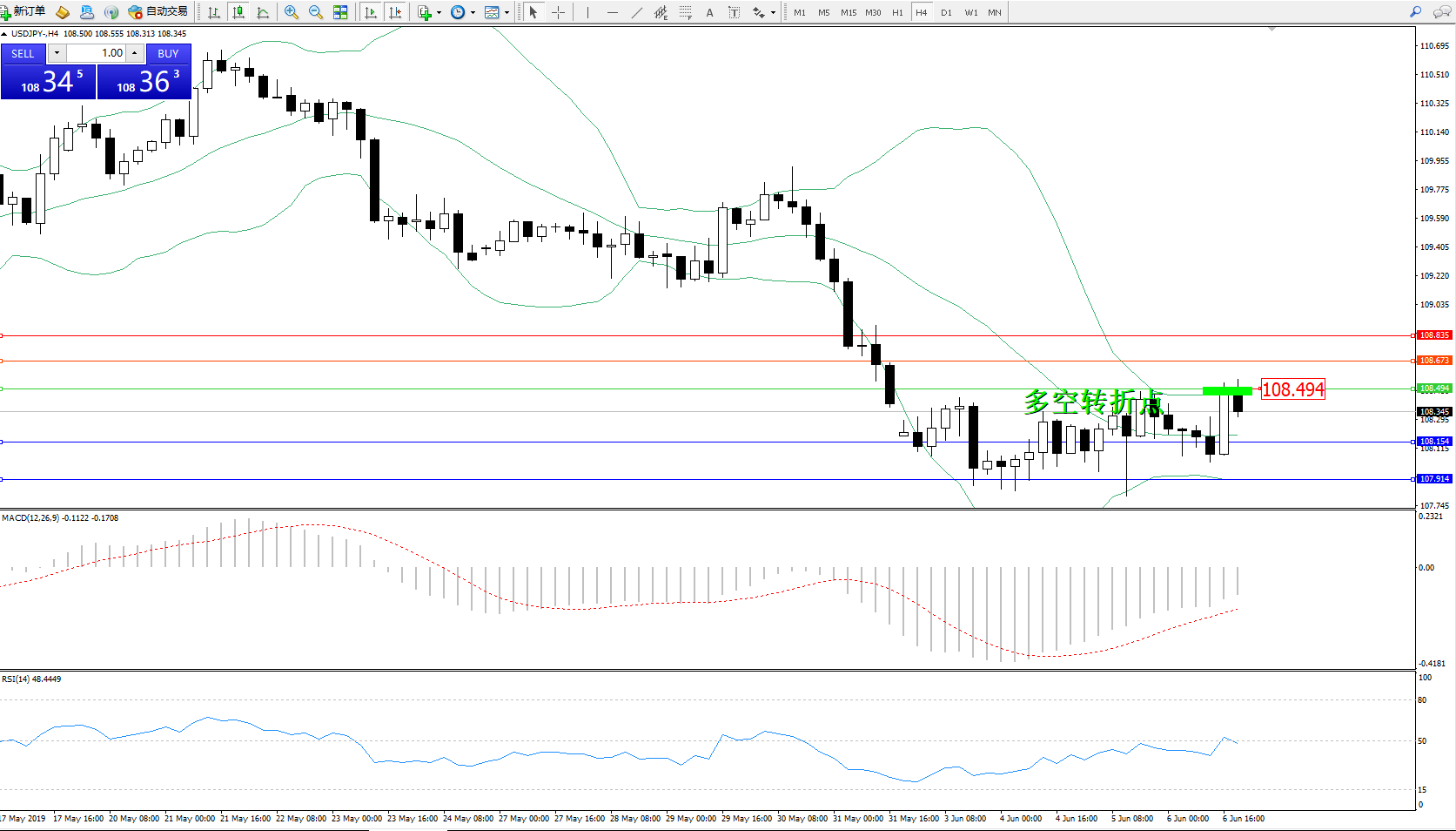 交易策略:108.494下方看跌,目标108.154、107.914