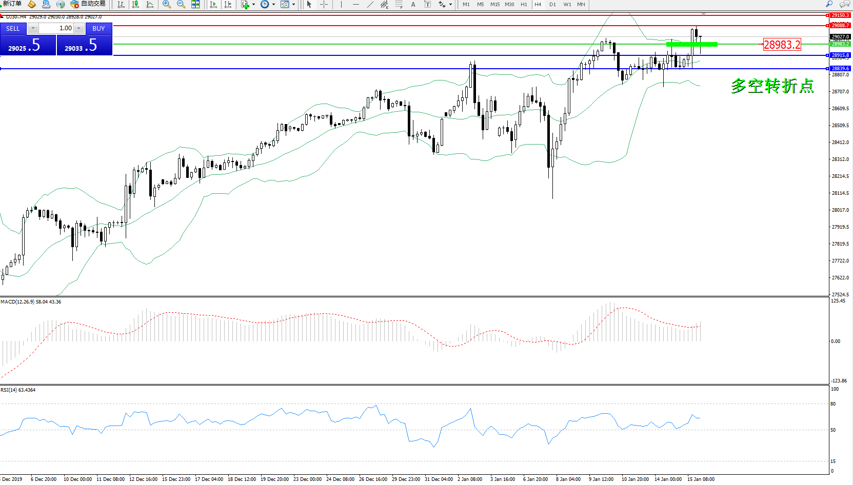道琼斯指数DJ30—— 4小时K线图显示: