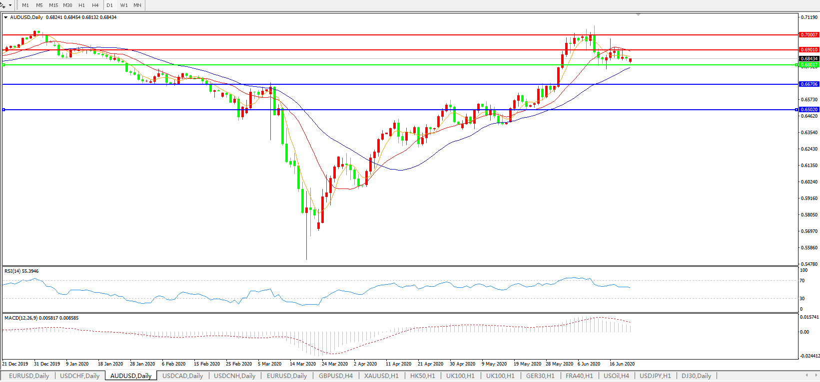 技术面简析:日图短期均线下穿长期均线,汇价高位窄幅整理,MACD运行于0轴上方但量能持续微缩量,RSI缓步走弱,预计汇价短线大概率将继续下行修正,短期关注下方0.68关口支撑。