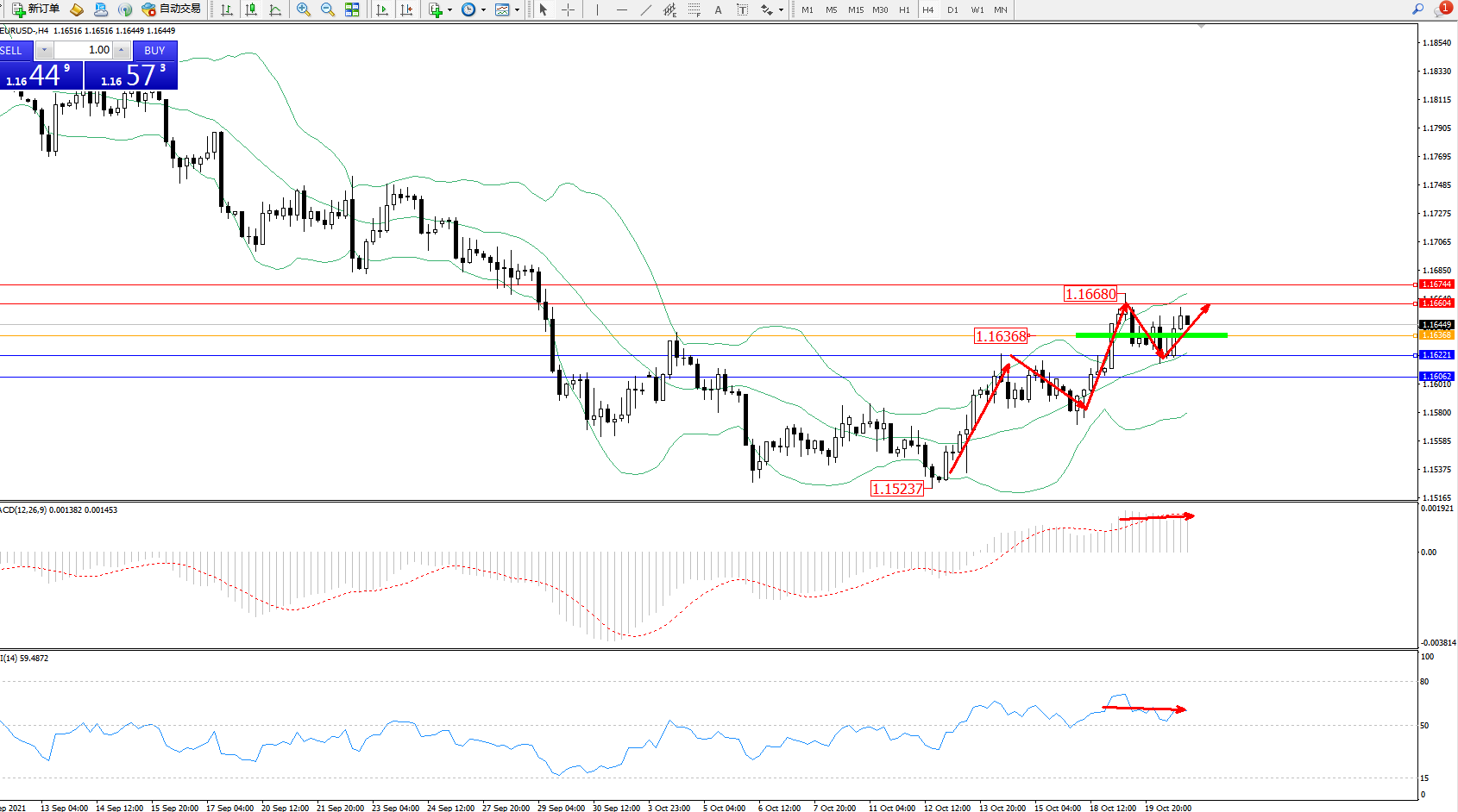 技术点评:低位多头动力延续布林带指标通道中上轨区间持续震荡上扬,高位抵达1.16680附近后开始短暂回撤整理,但依旧处于布林带指标通道中上轨区间震荡向上拉升中,布林带真不错呈收口走势上移,MACD指标处于多头区域维持整理平移中,RSI指标处于多头区域维持整理平移中;