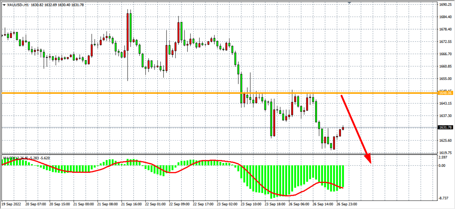 1小时图看,金价再度下破1626美元的前低点创出新低,空头延续下行,MACD于零轴之下量能开始有所缩短,显示下跌出现背离,日内或有反弹修复需求,上方强阻力于1648美元附近。