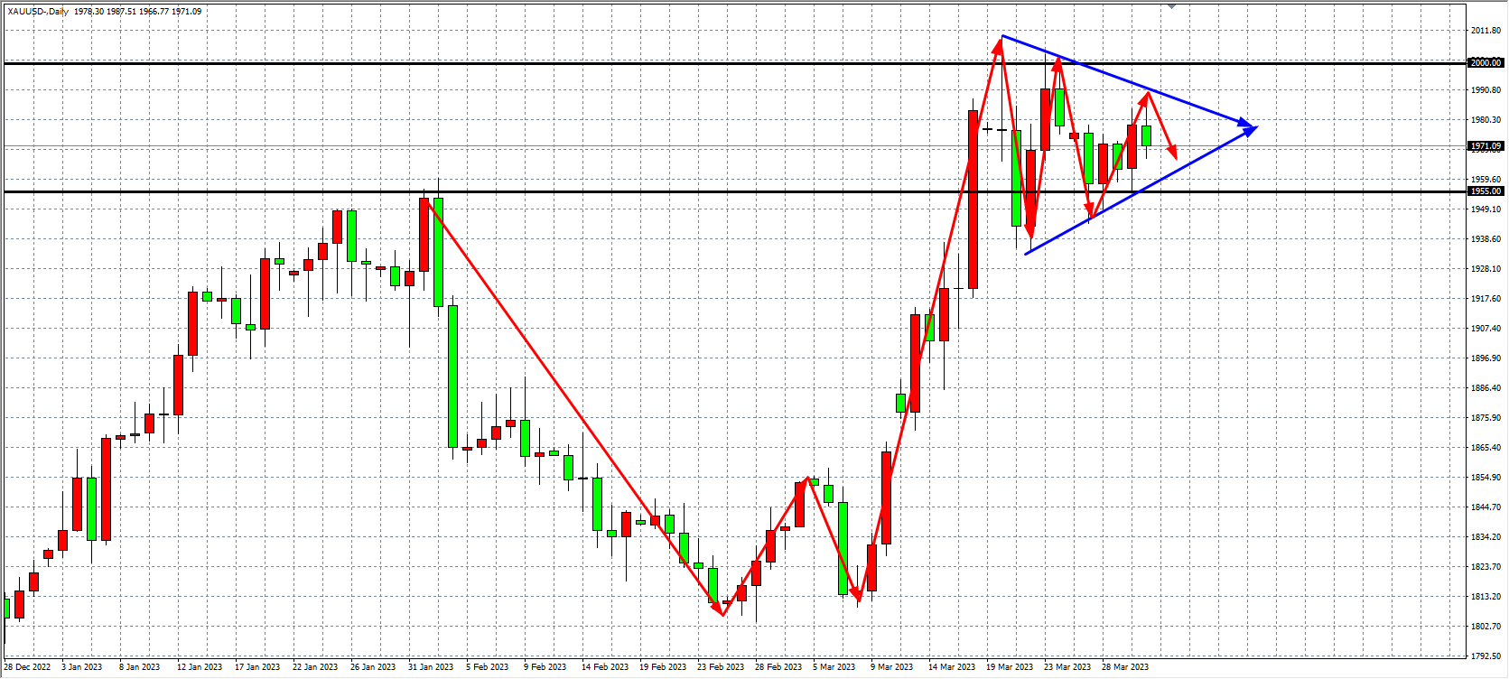 周五,美国2月PCE报告呈现了通胀出现了下降,数据显示核心PCE物价指数年率为5.0%,远低市场预测的5.1%和修正后的前值5.3%,金价并未受到利好提振,在数据公布后迅速拉升又回吐涨幅,多空争夺剧烈,最终收盘小幅收跌,周线收出十字星阴K线。