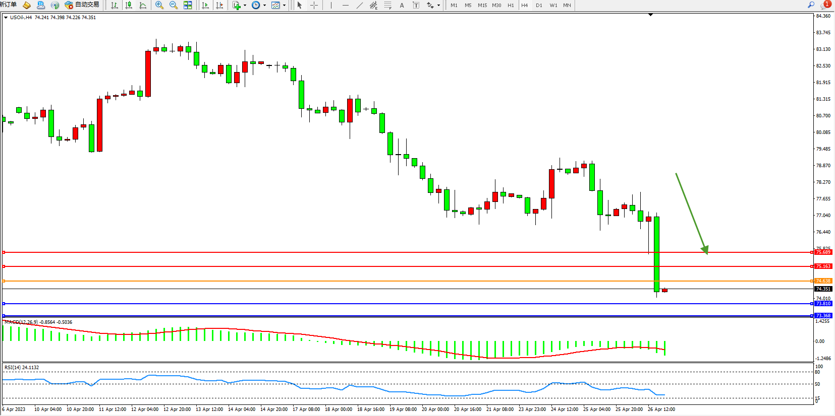 交易策略:74.638下方看跌,目标73.810 73.368